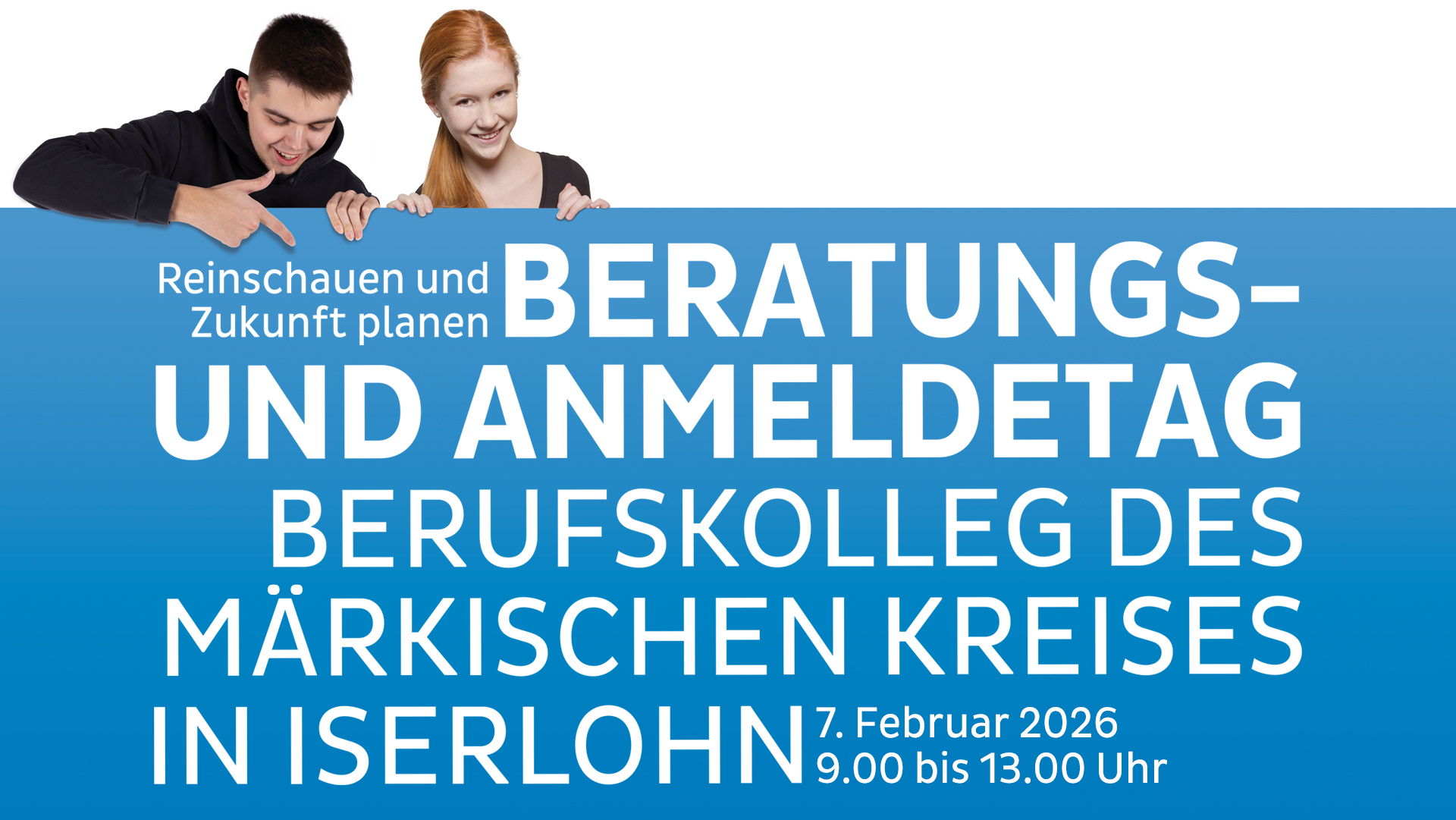 Ihr wollt eure berufliche Zukunft planen und wissen, wie ihr zu eurem Wunschberuf kommt? Dann kommt zu unserem Beratungs- und Anmeldetag am Samstag, dem 7. Februar 2026 in der Zeit von 9:00 Uhr – 13:00 Uhr an unserem Standort Hansaallee in Iserlohn vorbei!