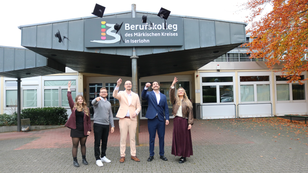 Foto der frisch gebackenen Bachelor-Absolventen mit ihren Urkunden, bevor sie sich am Haupteingang des Berufskollegs aufstellten, um anschließend ihre Bachelor-Hüter feierlich in die Luft zu werfen!